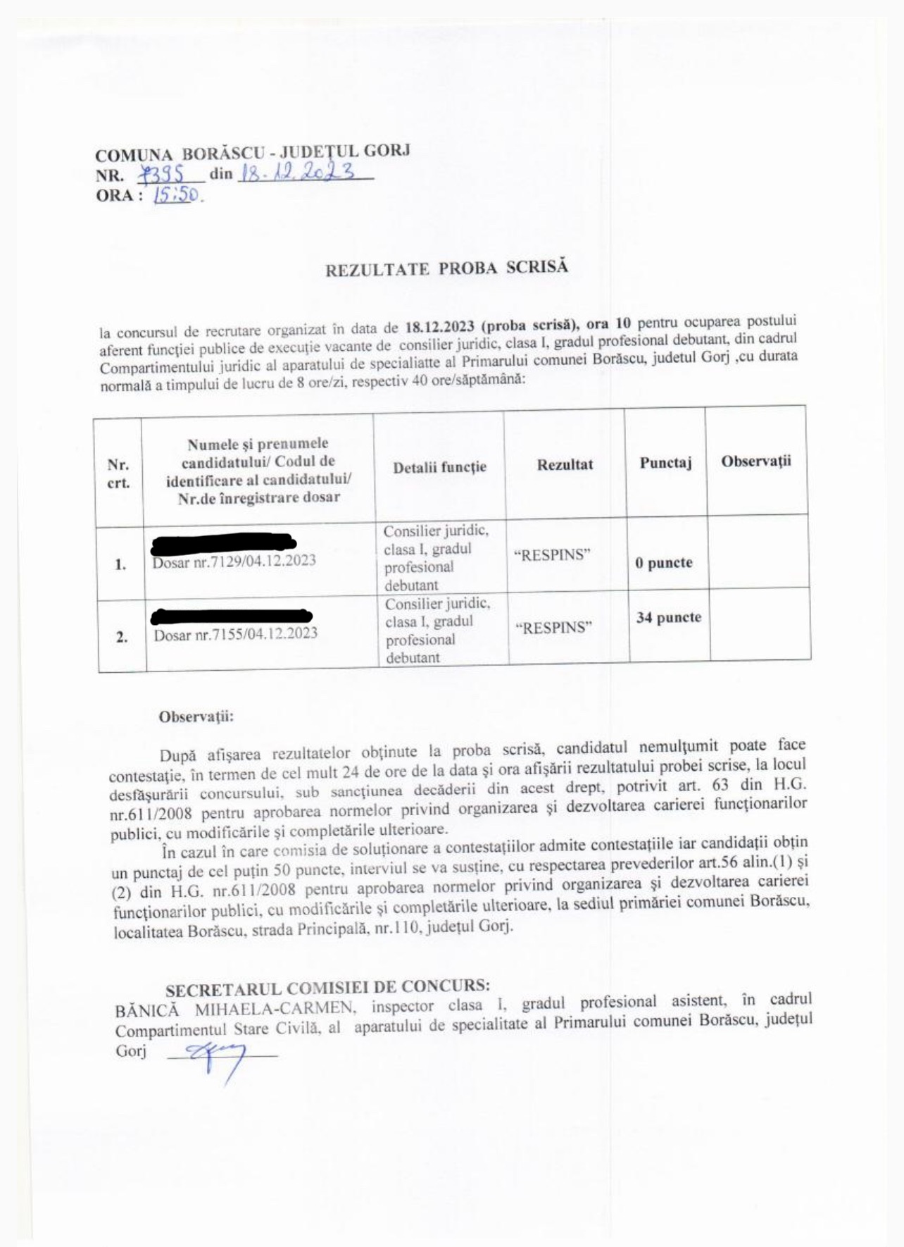 Anunt - concurs rezultat proba scrisa pentru ocuparea postului de consilier juridic ,clasa I ,gradul profesional debutant,din cadrul Compartimentului juridic al aparatului de specialitate al Primarului comunei Borascu